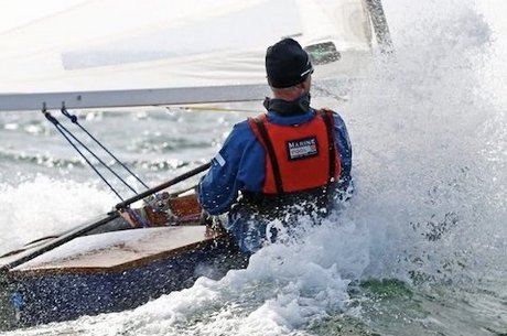 The sailors are fully concentrated on steering their boat through the waves in a controlled manner, despite the wind and waves.